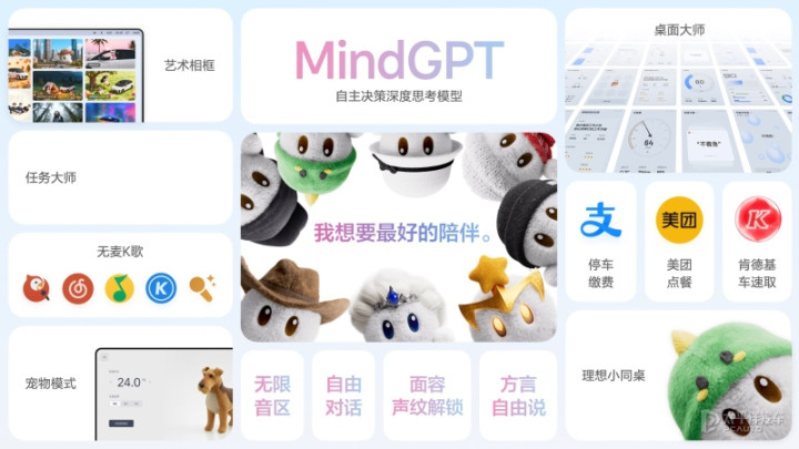 智能座舱方面,理想i6搭载高通骁龙8295P芯片,已接入DeepSeek大模型,支持5G网络、AI理想同学、MindGTP大模型、四音区语音识别唤醒、手势识别、声纹识别、应用商店、多指飞屏操控、手机APP远程控制、车载KTV等功能。
