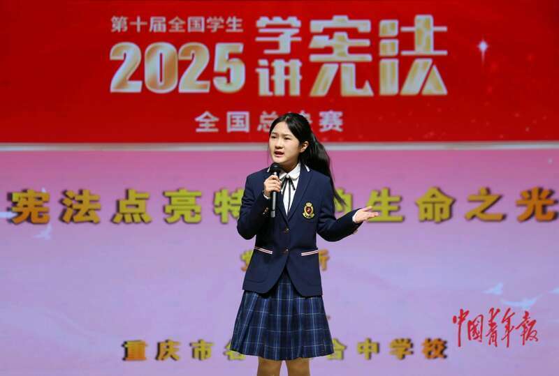 12月4日,北京育才学校,“宪法晨读”活动现场进行第十届全国学生“学宪法 讲宪法”比赛全国总决赛优秀作品展演,来自重庆市名校联合中学的党渝昕进行题为“宪法点亮特别的生命之光”的演讲。中青报·中青网记者 陈剑/摄