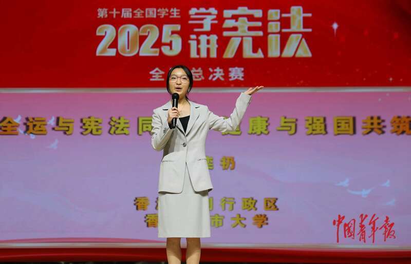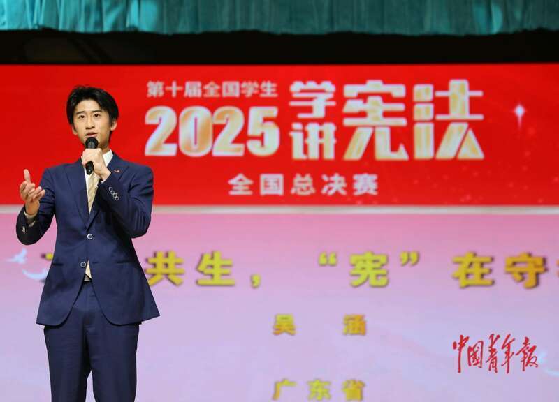 12月4日,北京育才学校,“宪法晨读”活动现场进行第十届全国学生“学宪法 讲宪法”比赛全国总决赛优秀作品展演,来自香港城市大学的陈奕礽进行题为“全运与宪法同行,健康与强国共筑”的演讲。中青报·中青网记者 陈剑/摄