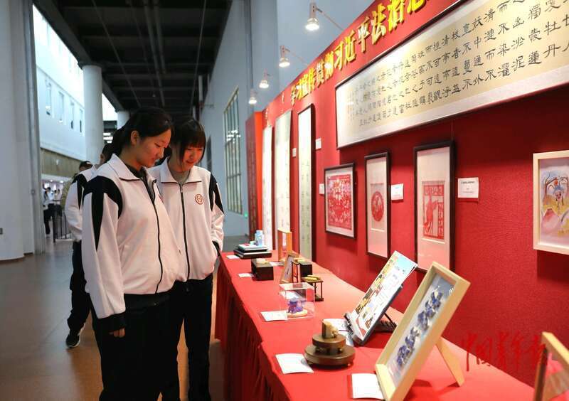 12月4日,北京育才学校,“宪法晨读”活动开始前,学生们在参观首都教育系统师生“八五”法治文化作品展示。中青报·中青网记者 陈剑/摄