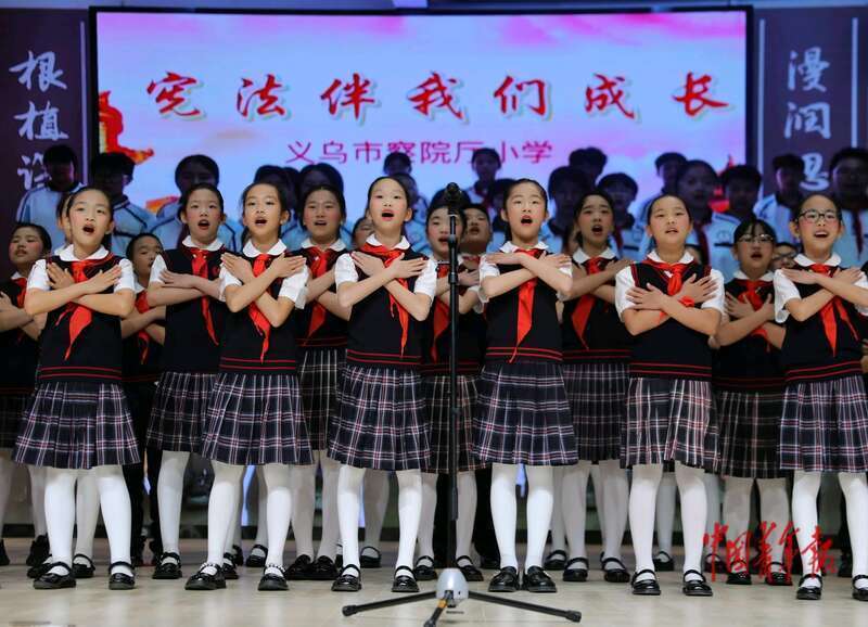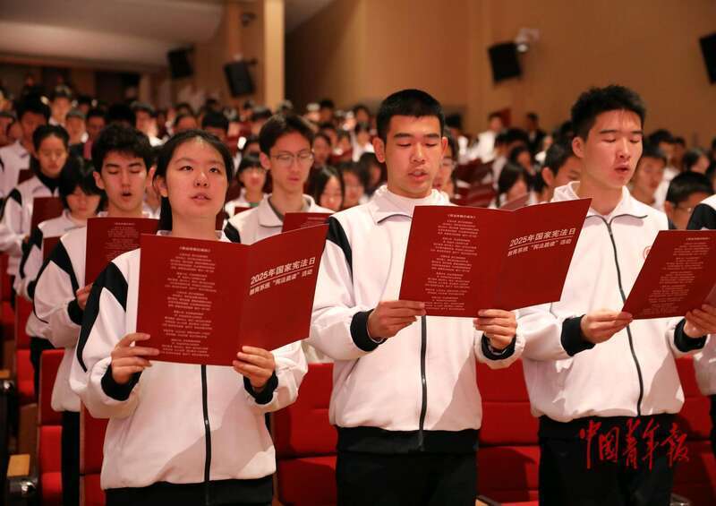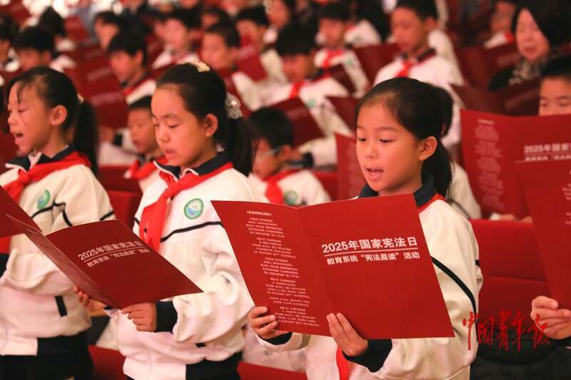 12月4日,北京育才学校,学生合唱歌曲《宪法伴我们成长》,各地学校通过青少年普法网直播跟唱。当日,国家宪法日教育系统“宪法晨读”活动在北京育才学校举行。自2014年以来,教育部每年组织全国各地大中小学生开展“宪法晨读”活动,加强青少年宪法法治教育,有效营造尊法学法守法用法的良好氛围。中青报·中青网记者 陈剑/摄