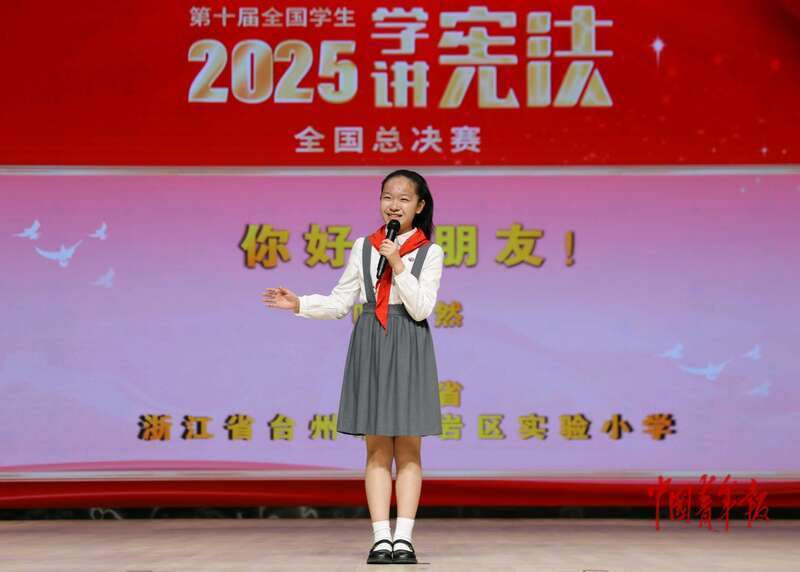 12月4日,北京育才学校,“宪法晨读”活动现场进行第十届全国学生“学宪法 讲宪法”比赛全国总决赛优秀作品展演,来自浙江省台州市黄岩区实验小学的叶悠然进行题为“你好,朋友!”的演讲。中青报·中青网记者 陈剑/摄