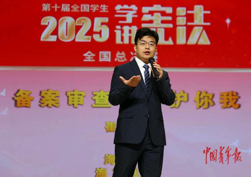 12月4日,北京育才学校,“宪法晨读”活动现场进行第十届全国学生“学宪法 讲宪法”比赛全国总决赛优秀作品展演,来自海南大学的崔子恒进行题为“备案审查,守护你我”的演讲。中青报·中青网记者 陈剑/摄