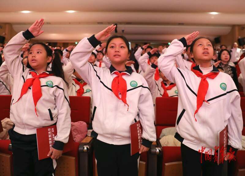 12月4日,北京育才学校,“宪法晨读”活动现场,少先队员在升旗仪式上行队礼。中青报·中青网记者 陈剑/摄
