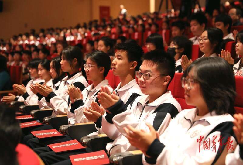12月4日,北京育才学校,“宪法晨读”活动现场,学生们在鼓掌。中青报·中青网记者 陈剑/摄
